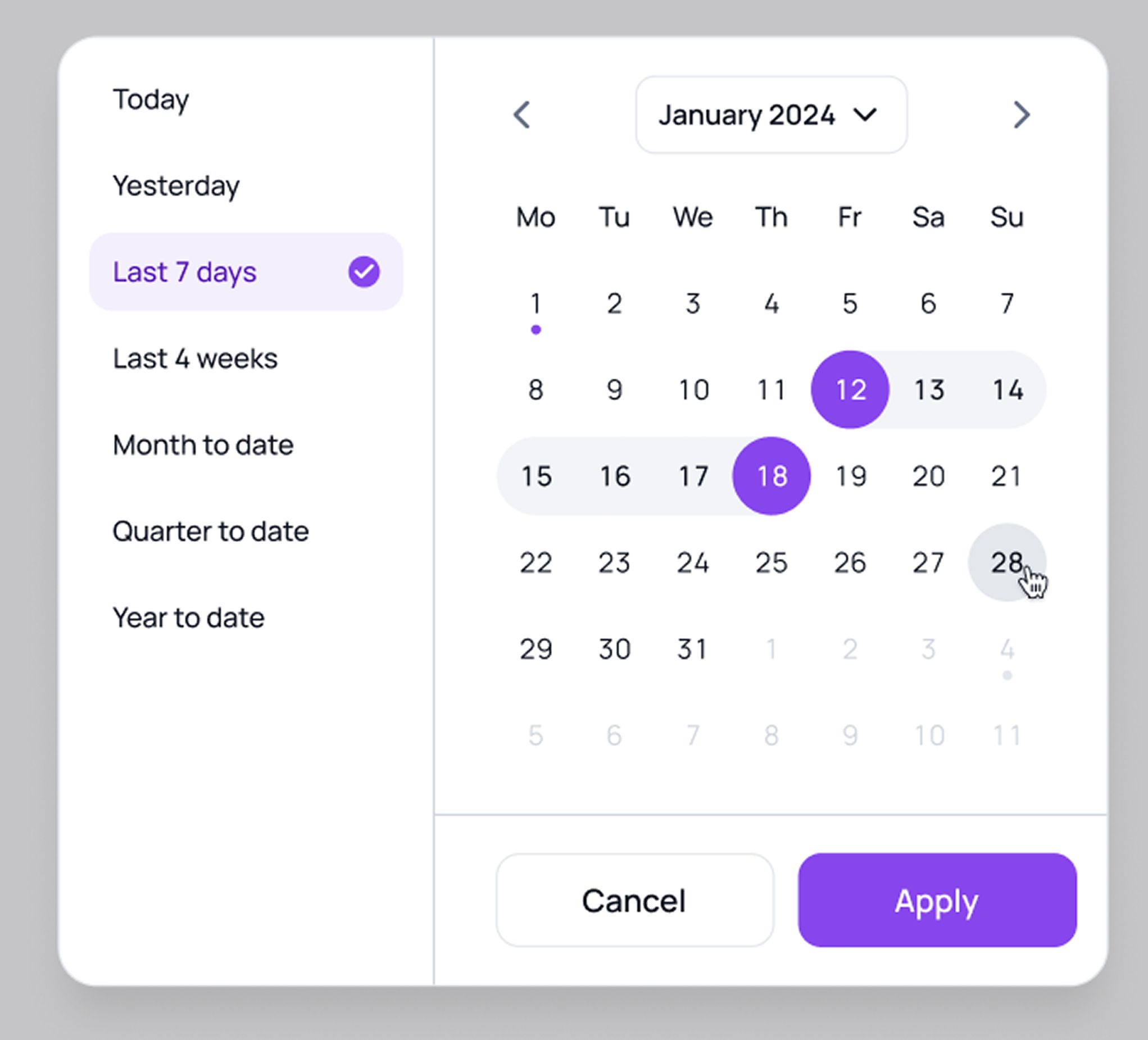 Access key time periods instantly! Now, you can pull data for the last 7 days, 4 weeks, and more with just a single click, saving you time scrolling and manually setting dates.