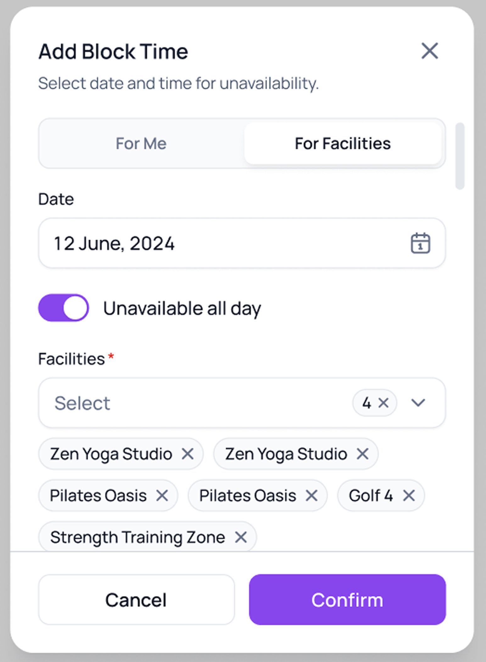 We've made facility management easier when running events or maintenance. Go to Calendar > Add > Block time > For facilities and select as many resources/facilities as you need. All will be blocked simultaneously. You can now block time directly from the Staff App as well.