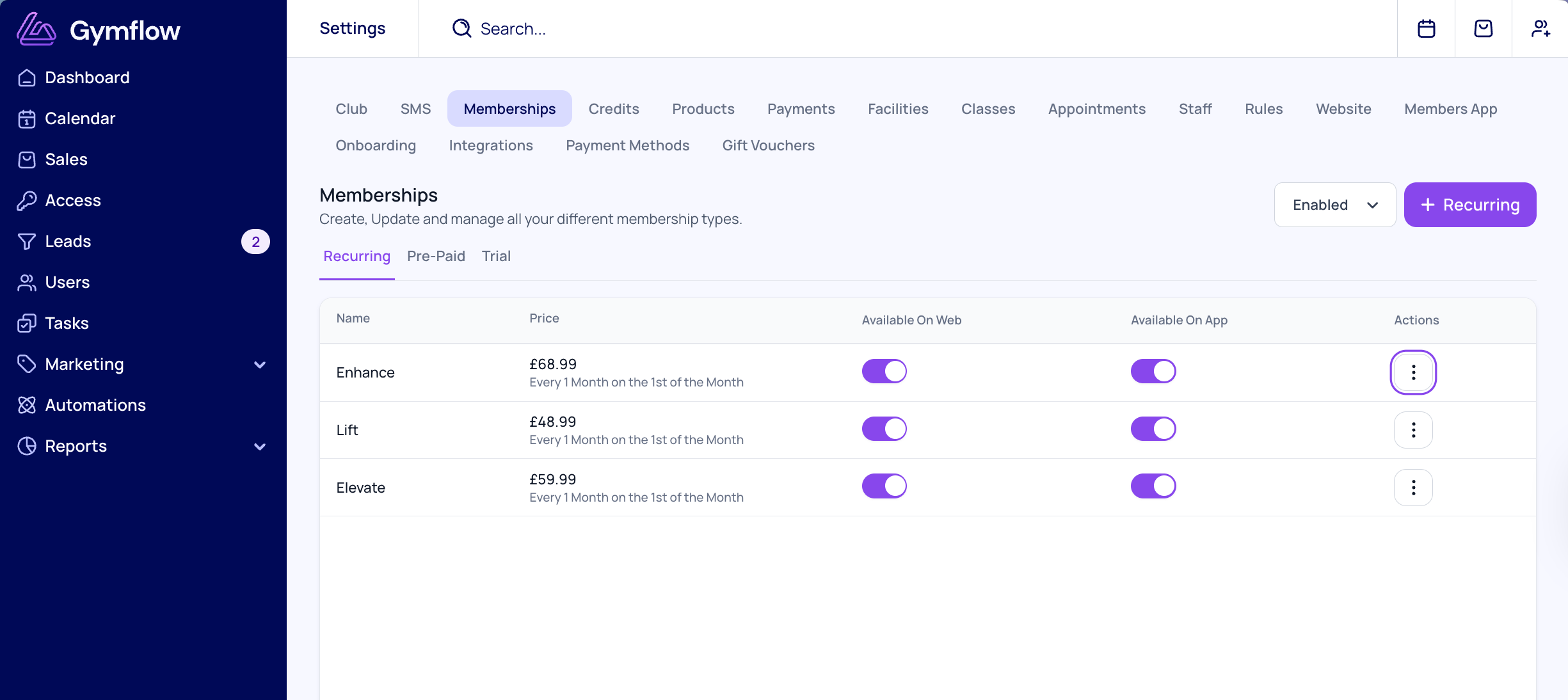 Choose whether memberships and/or credit packs are available on Web, Mobile, or both
