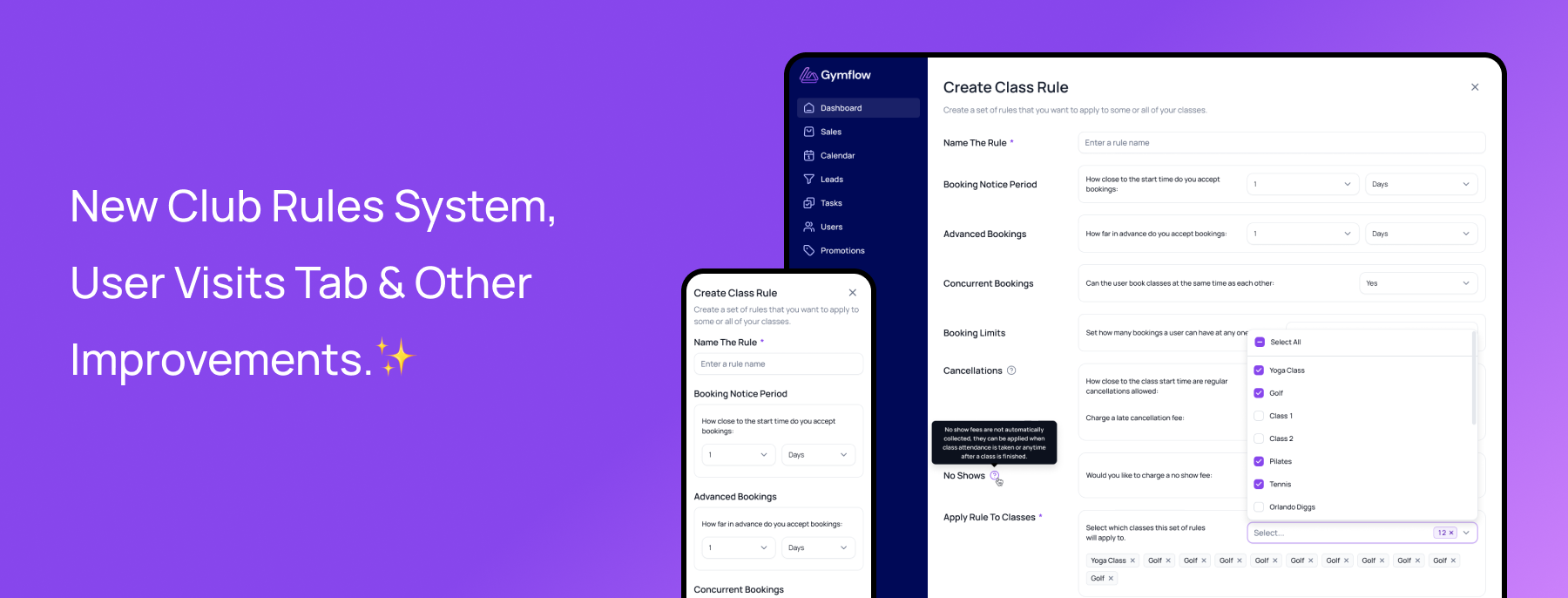 You can now create sets of rules and apply them only to selected classes or appointments to allow total control over your booking rules.